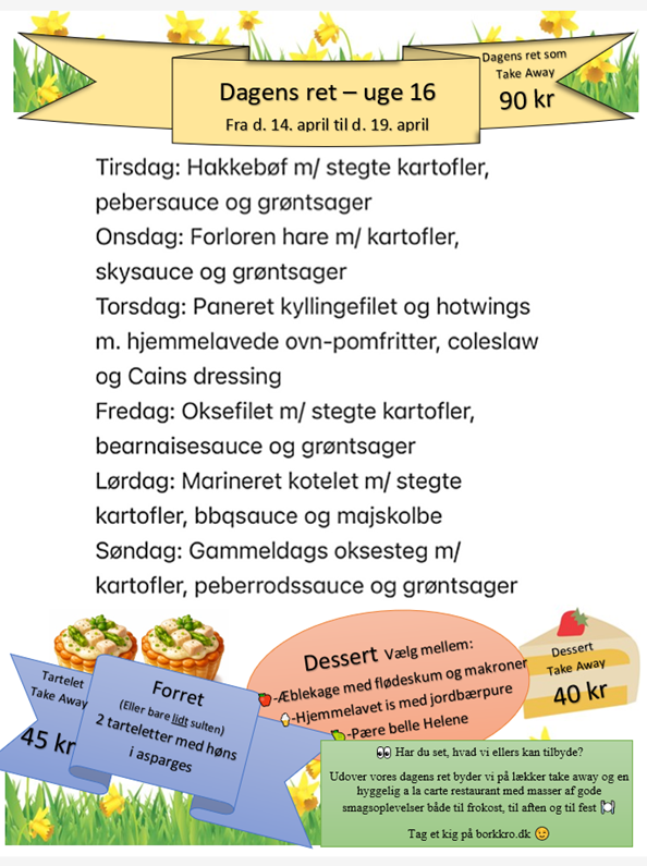 Der er udlevering af take away tirsdag til søndag mellem kl. 17.00-19.30.