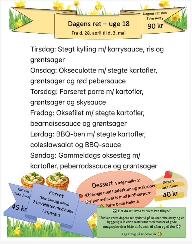 Vi anbefaler, at forudbestille dagens ret ved at ringe på tlf 75280009 og aftale tidspunkt for afhentning.